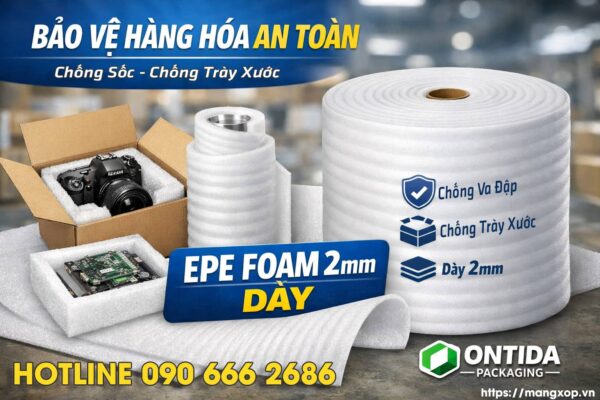 Trong lĩnh vực đóng gói và vận chuyển, cuộn xốp EPE Foam 2mm (màng xốp Pe foam) được coi là “lớp áo giáp” quốc dân nhờ sự cân bằng hoàn hảo giữa độ dẻo dai và khả năng chống trầy xước. Tại miền Bắc, Ontida Packaging tự hào là đơn vị tiên phong, cung cấp giải pháp màng xốp chất lượng cao với quy mô sản xuất hàng đầu thị trường.